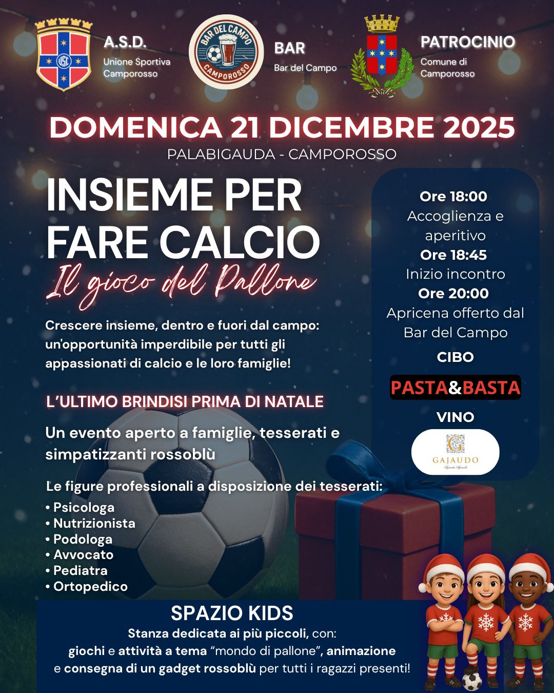 Cos'è Domenica 21 dicembre dalle ore 18.00 presso la sala Tigli del Centro G. Falcone a Camporosso serata “Insieme per fare calcio” a cura dell’U. S. CAMPOROSSO - Ingresso libero - Evento patrocinato dal Comune di Camporosso