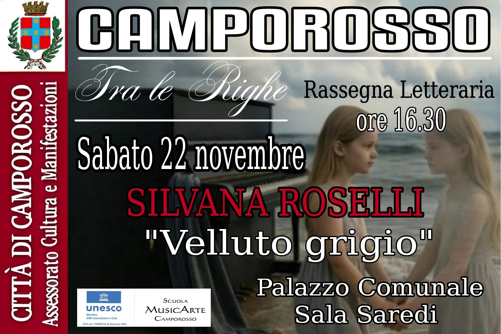 Rassegna autunnale di presentazioni di libri scritti da autori locali “Camporosso tra le righe” presso la sala “Mario Saredi” del Comune di Camporosso: secondo appuntamento sabato 22 novembre alle ore 16.30 con la presentazione del libro di Silvana Roselli dal titolo “Velluto grigio” – intermezzi musicali a cura della Scuola Musicarte di Camporosso. Al termine rinfresco offerto dall’Amministrazione Comunale – Ingresso libero